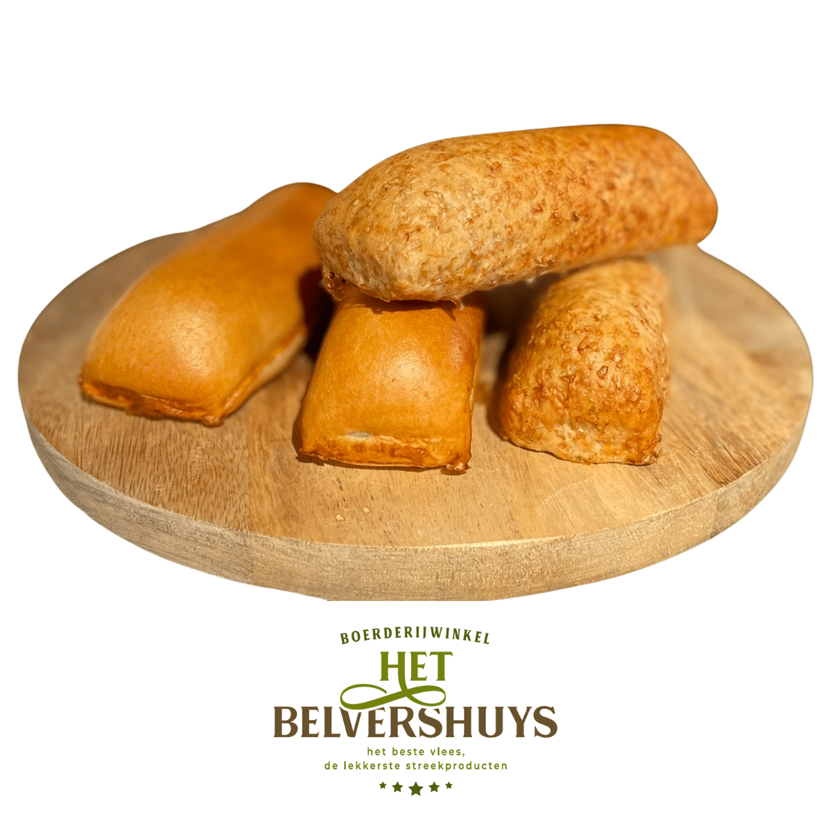 4 Bruine worstenbroodjes gevuld met lekker mals gekruid gehakt van onze eigen varkens.