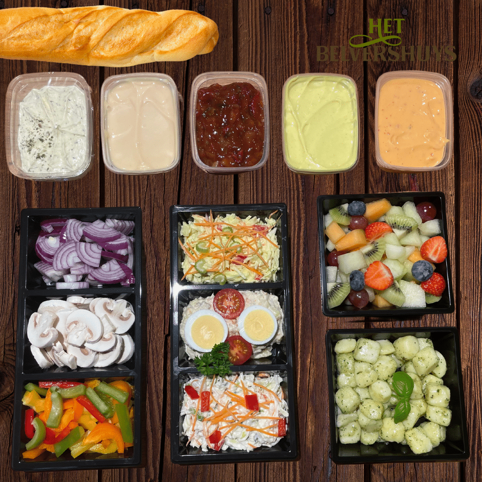 Maak je vlees- of visgourmet compleet met verse salades, aardappeltjes, afbakstokbrood en natuurlijk verschillende sausjes. We verzorgen het graag, zodat jij en je gasten alleen hoeven te genieten!