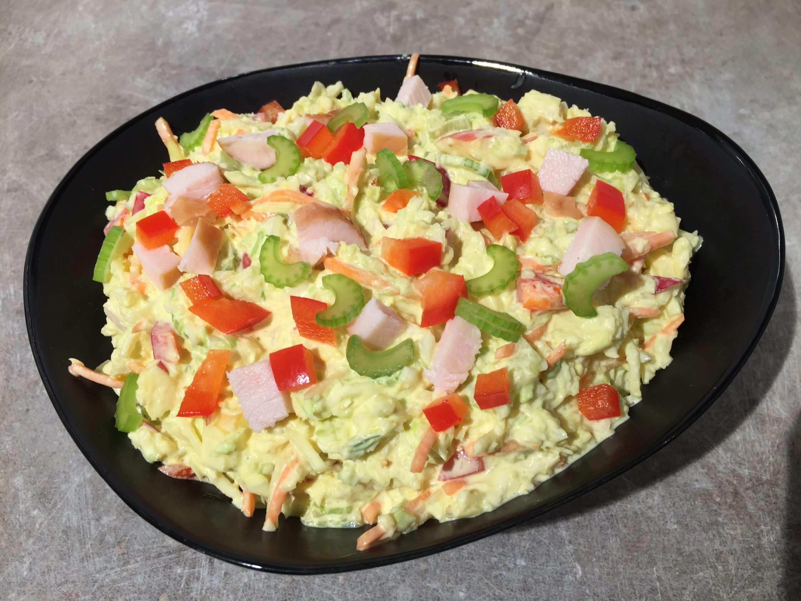Rauwkostsalade met spitskool, selderij, bleekselderij, wortel, paprika, appel, ananas, kleine stukjes kipfilet en dressing op basis van yoghurt en mayonaise en kerrie.